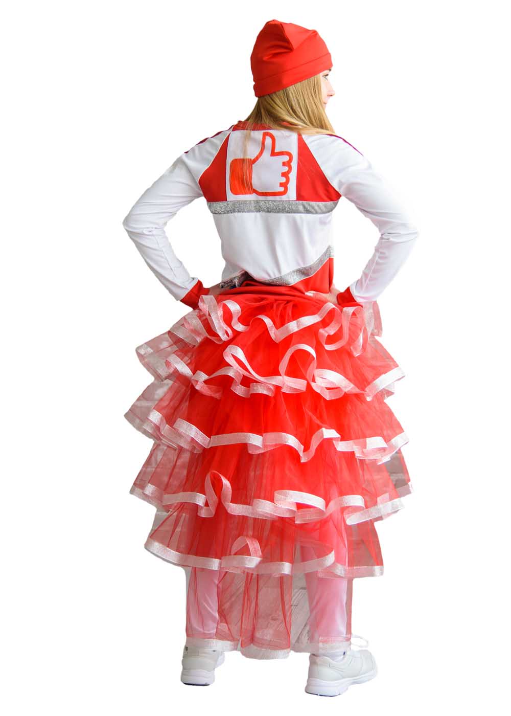 Взрослый костюм Блогера выполнен из качественных материалов. Основные цвета: белый и красный. Кофта, лосины и головной убор пошиты из трикотажной ткани. Они декорированы вставками из ткани с лазерным эффектом и логотипами социальных сетей YouTube, Instagram, Tik Tok и Likee. Пышная юбка из многослойного фатина удлинена сзади, добавляя образу динамичности и оригинальности. Костюм идеально подходит для тематических вечеринок и мероприятий, связанных с миром социальных сетей и блогеров.