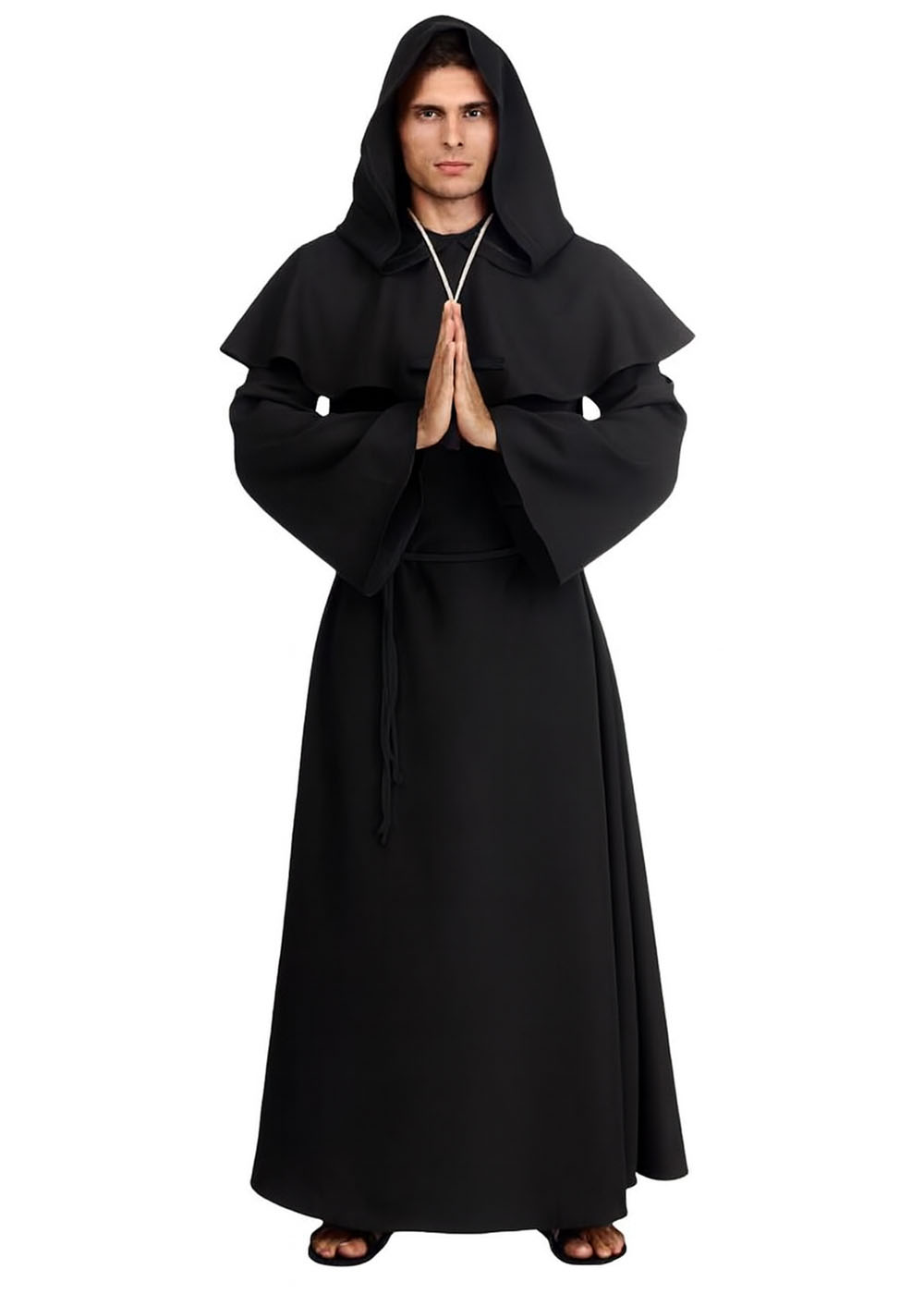 Чорный костюм монаха с застежкой на липучке по центру спины, расширенные рукава и капюшон с широким воротником. Пояс завязывается по желанию.