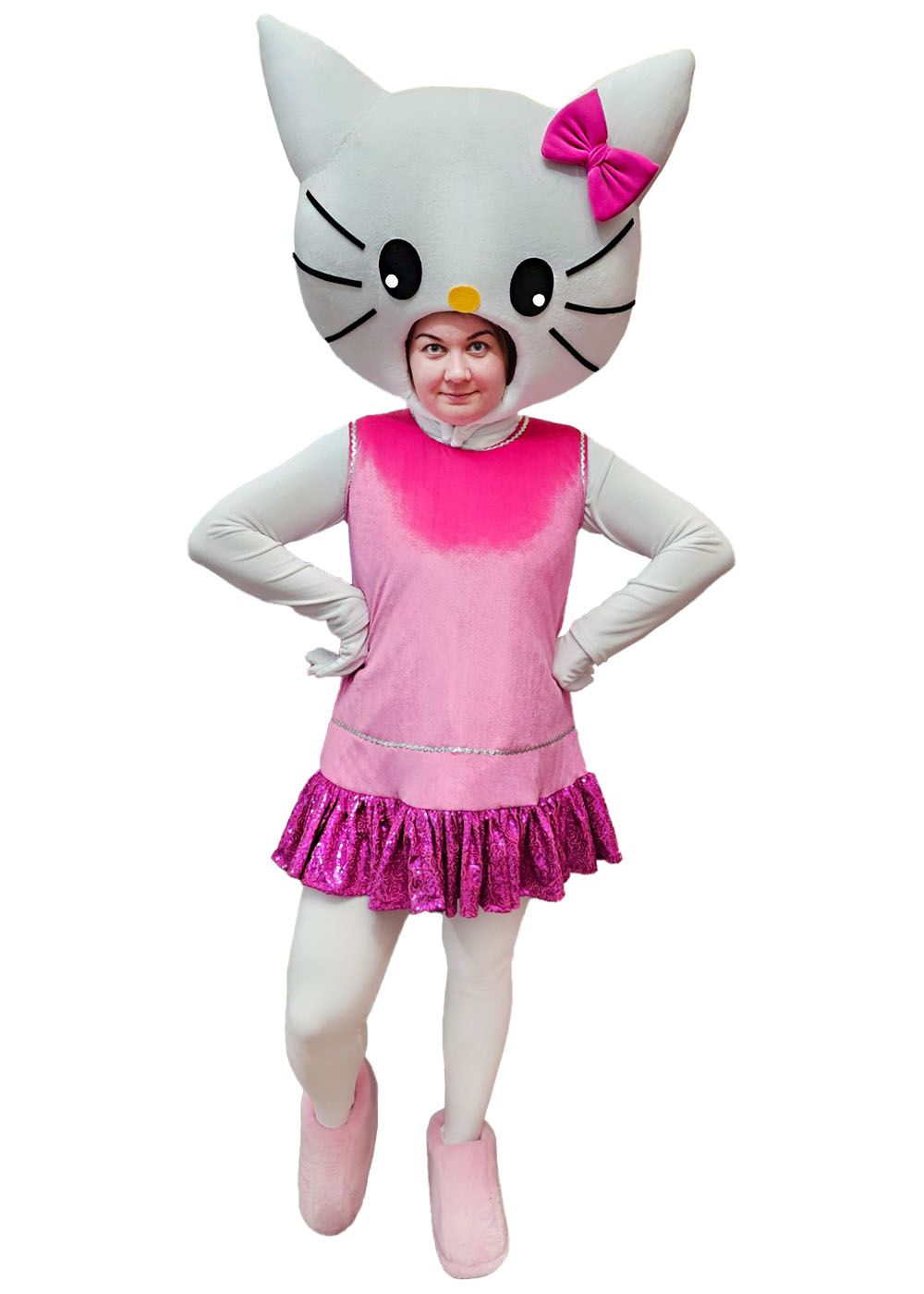 Ростовая кукла "Hello Kitty" - это воплощение милоты и нежности в каждой детали. Она оживает благодаря искусному аниматору, который придает этому персонажу своеобразный шарм и характер. Каждое движение куклы наполнено добротой и радостью, принося улыбки на лица всех, кто видит её. Костюм "Hello Kitty" изготовлен из высококачественных и безопасных материалов, обеспечивая комфорт и безопасность в использовании. Голова на поролоновом каркасе, которая создает иллюзию реалистичного вида персонажа, а сетчатые глаза позволяют аниматору свободно взаимодействовать с окружающим миром, придавая кукле живость и выразительность.