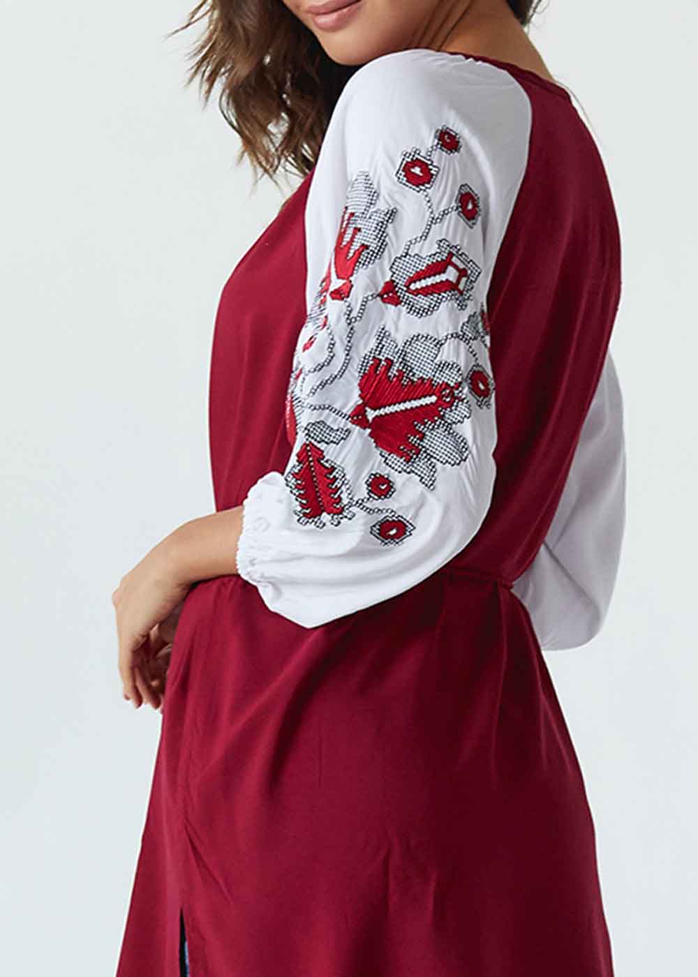 Женская туника Свитозара представлена в бордовом цвете и выполнена из ткани высокого качества штапель. Предлагается в нескольких размерах. Вышитая туника прямого кроя. Длина рукава ¾. Пояс дополняет комплектацию. Объемные рукава декорированы старинной вышивкой.