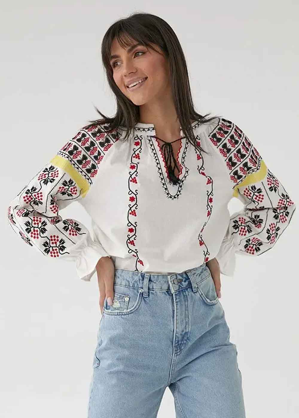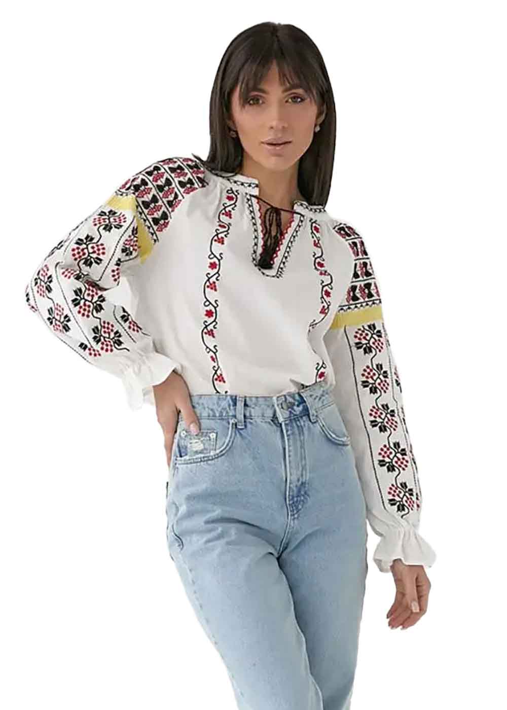 Женская вышиванка Калина - яркий пример изысканной традиционной одежды с современным акцентом. Белая ткань служит идеальным фоном для разнообразной и живописной вышивки, которая украшает не только переднюю часть, но и всю длину рукавов. Завязочки спереди добавляют дополнительный шарм, подчеркивая изысканность и художественное оформление вышивки. Вышиванка объединяет в себе традиционные элементы и уникальный стиль, делая идеальным выбором для особых случаев и праздников.