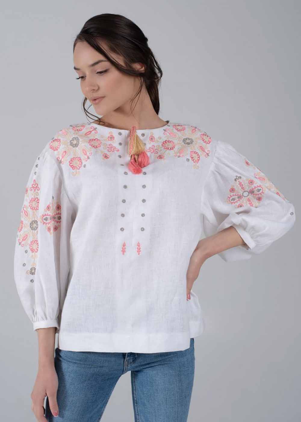 Сорочка олицетворяет украинские традиции. Оттенки розового, бежевого и серого отлично сочетаются в вышивке. Суженый рукав к запястью изящно подчеркивает женственность и хрупкость образа. Прекрасное сочетание цветовой гаммы, расположения орнамента, комфорт и качество, подчеркивают изысканный вкус ее обладательницы.