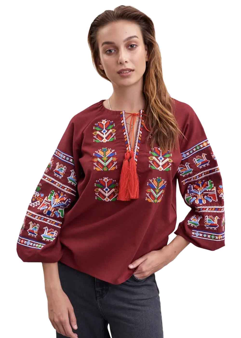 Женская вышиванка Мальва бордо выполнена из качественного материала. Прекрасно сочетается с юбкой, джинсами, штанами.