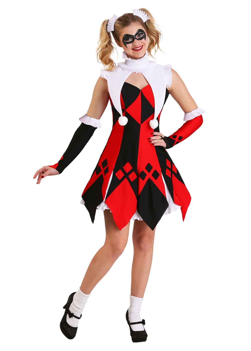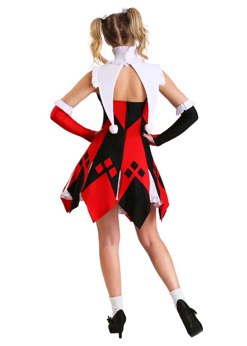 Женский костюм Арлекина включает в себя платье с молнией на спине и регулируемыми бретельками. На юбке нанесен узор в виде ромбов. Воротник с застежкой на липучке на затылке с шариками на кончиках