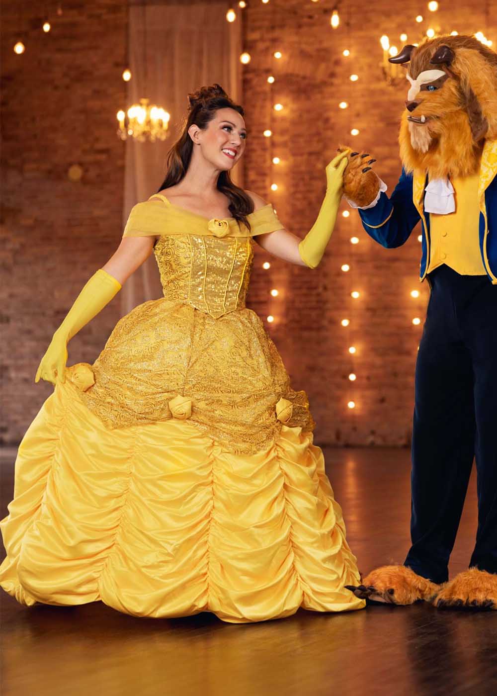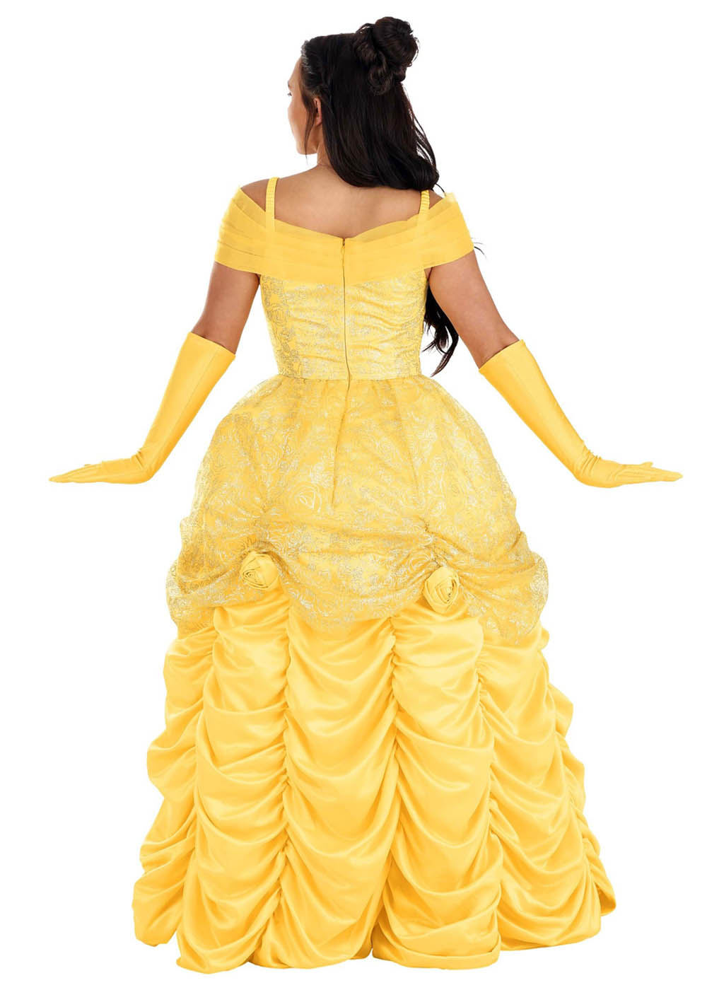 Костюм Белль превратит вас в настоящую принцессу! Платье с тканью из сатина и тюля, полностью на подкладке, с встроенным подъюбником. Горловина украшена узкими эластичными бретельками. Основа платья выполнено из сатина с наложениями корсета из пайеток и органзы с печатными блестящими розами. Перчатки из эластичного трикотажа до локтя - легко одеваются.