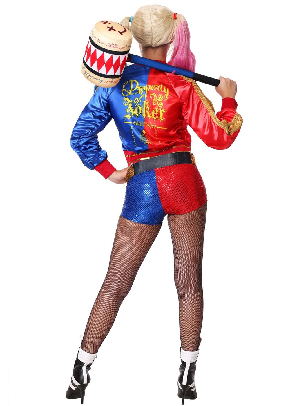 Этот костюм Харли Квин включает в себя кофту-топ из атласа с пришитым передом рубашки. Пайетковые шорты с эластичным поясом обеспечивают комфортную посадку. Пояс застегивается на липучку. Сетчатые колготки с эластичной резинкой в комплекте. Парик и обувь, показанные на фотографии, продаются отдельно.