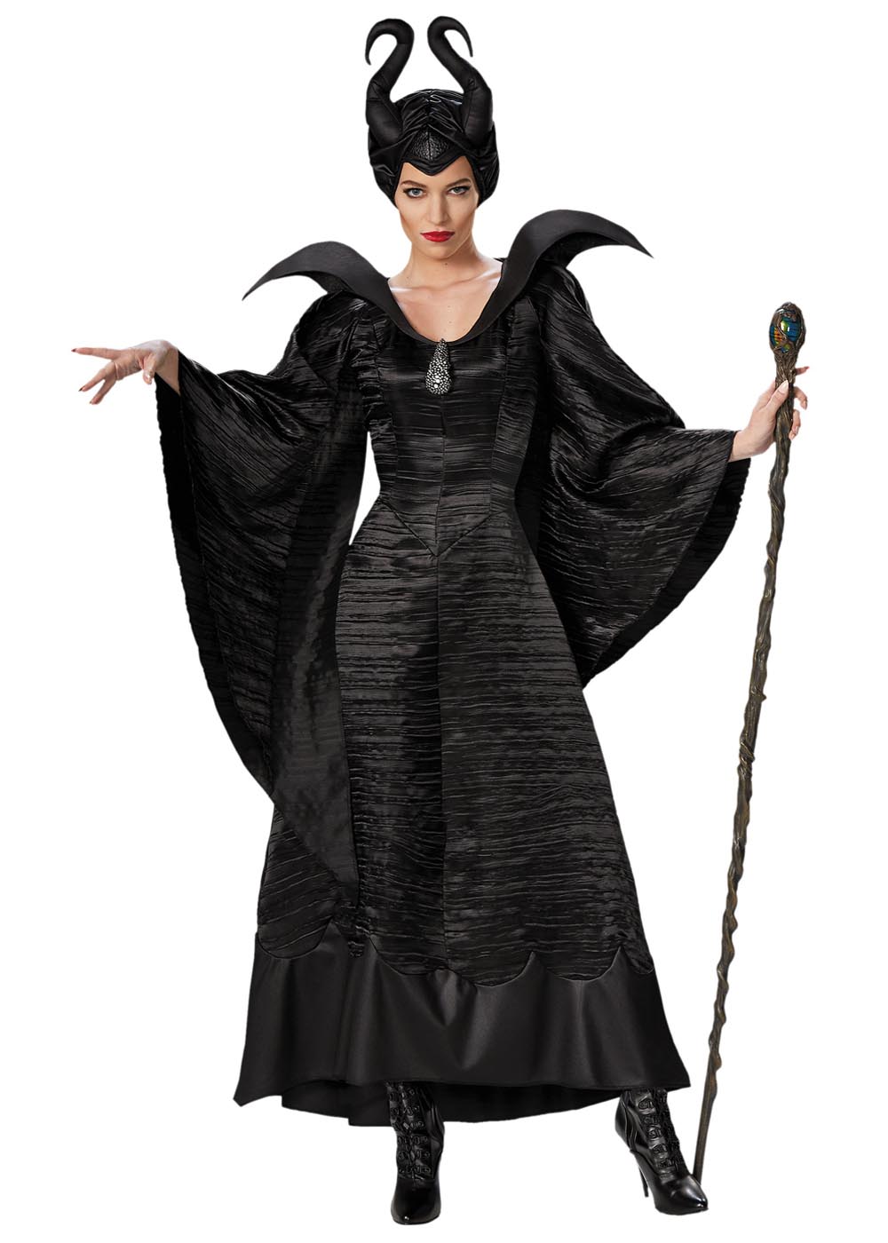 Черное платье Малифисенты закрывается на липучки сзади по центру. На платье можно прикрепить серебряную пластиковую брошь с помощью липучки. Головной убор персонажа имеет эластичные резинки и сверху черные рога из пенопласта.