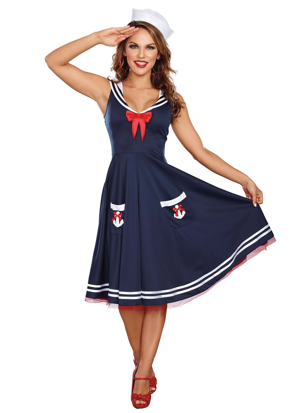 Платье с молнией по правому боковому шву. Квадратный морской воротник с окантовкой из атласной ленты. Юбка с 2 функциональными карманами, украшенными красными бантами и пайетками в виде якорей. Морская шляпа имеет эластичные петли по нижнему краю для крепления к волосам или крепления на ободок.