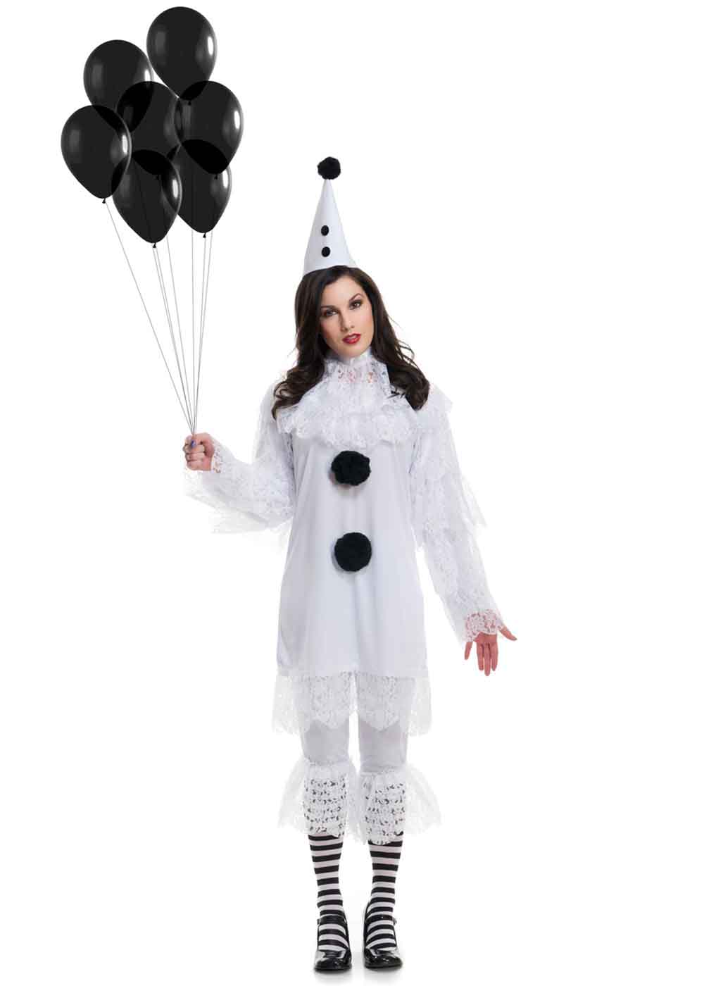 Женский костюм Арлекина включает в себя платье с молнией на спине и регулируемыми бретельками. На юбке нанесен узор в виде ромбов. Воротник с застежкой на липучке на затылке с шариками на кончиках