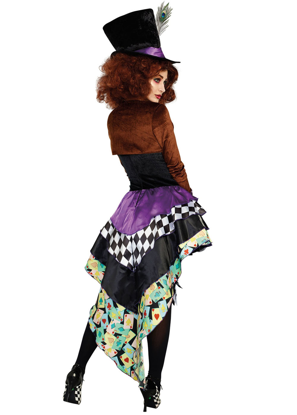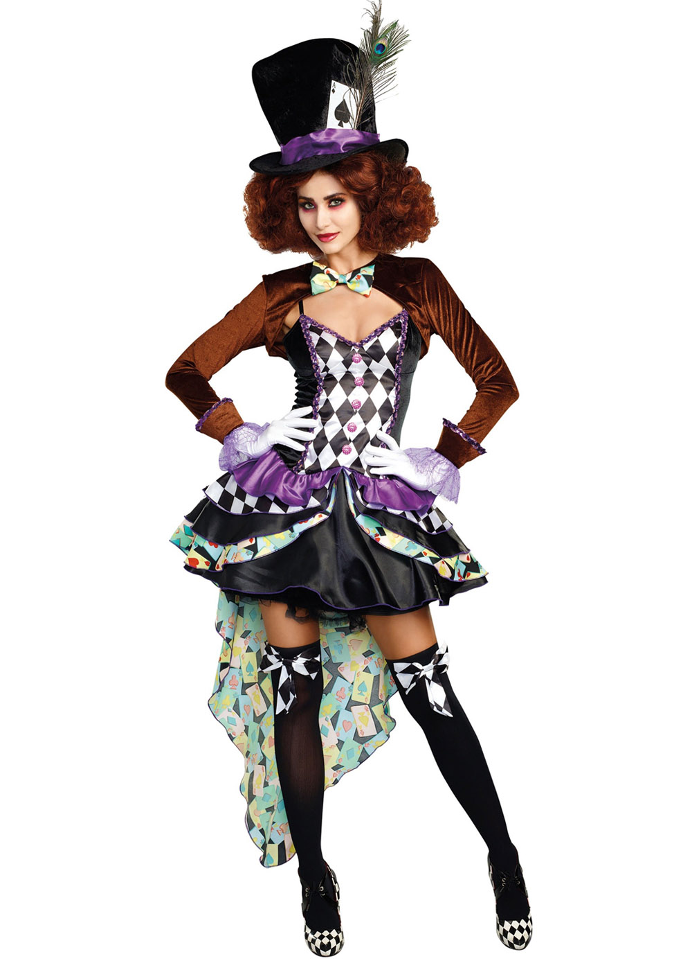 Костюм Сумасшедшей Шляпницы перенесет вас в странное и захватывающее приключение! Платье с молнией на спине и регулируемыми эластичными бретелями, украшенное вставкой в виде ромбового узора с золотой каймой и фиолетовыми пайетками. Многослойная юбка с асимметричным подолом, задняя часть длиннее. Шраг с бабочкой на шее, закрывающийся на липучку, с манжетами на рукавах, украшенными кружевом, пайетками и золотой каймой. Бархатная шляпа с проволочным краем, украшенная фиолетовой атласной лентой, на которой крепятся карта и павлиний перо. Риббон с ромбовым узором прикрепляется к чулкам при помощи безопасных булавок. Перчатки, пышный подюпник и чулки, изображенные на фото, продаются отдельно.