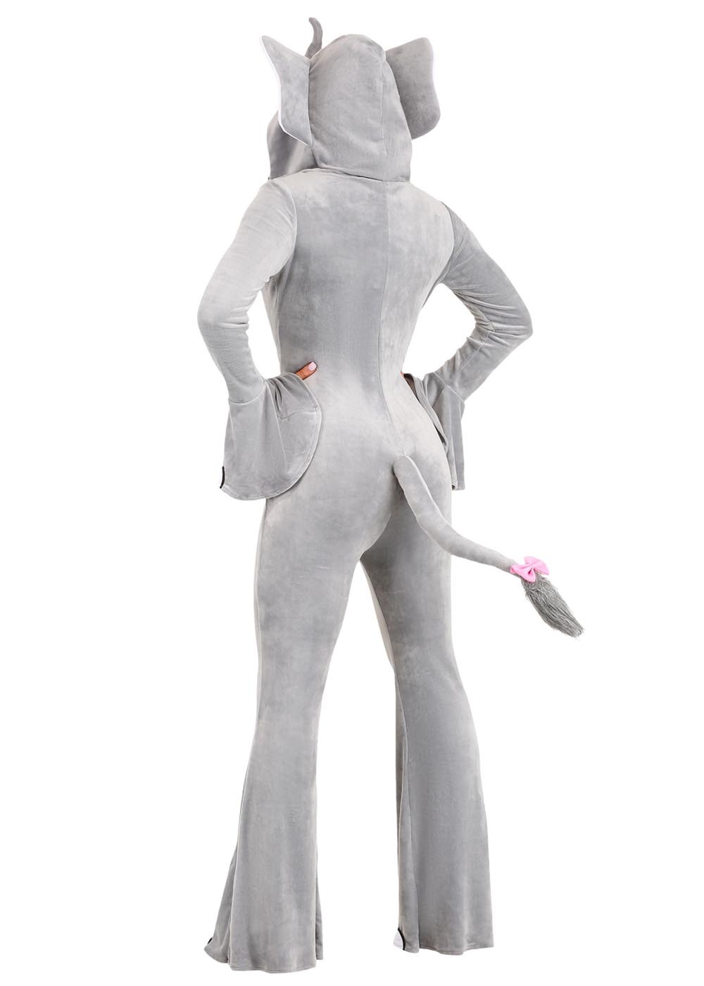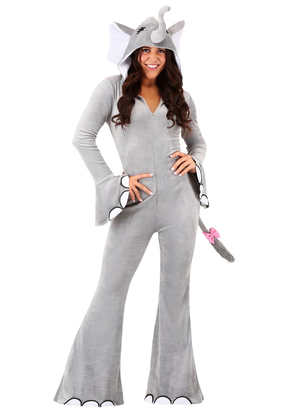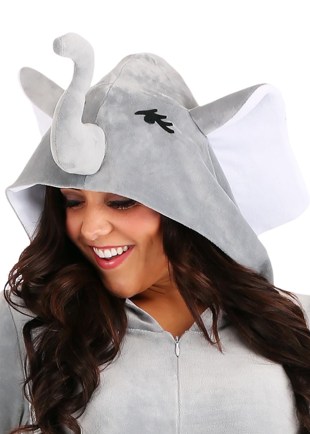 Костюм слонихи выполнен с молнией спереди для удобства надевания. Капюшон с мягким хобот и ушами, а также глазами. Расклешенные рукава на запястьях и штанины на ногах украшены когтями. Хвост пришит на спину костюма.