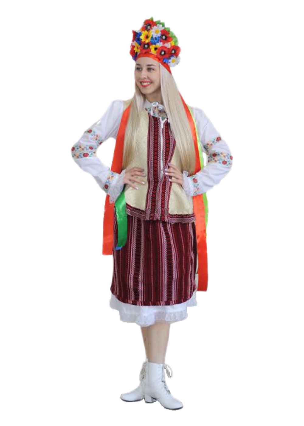 Женский народный костюм Днепропетровщины выполнен из жаккарда и хлопка. Включает веночек, блузку, жилетку, плахту, юбку и подъюбник. Блузка белого цвета с длинными рукавами украшена яркой цветочной вышивкой и декоративными лентами. Жилетка светлого цвета с вышивкой сочетается с плахтой в красно-белую полоску, придавая костюму традиционный и нарядный вид. Веночек с разноцветными лентами завершает образ, создавая атмосферу праздника.
