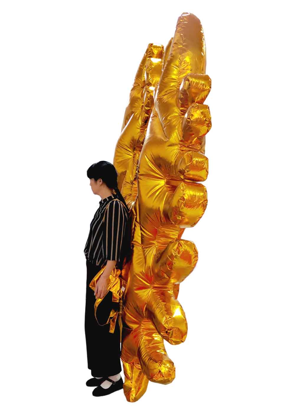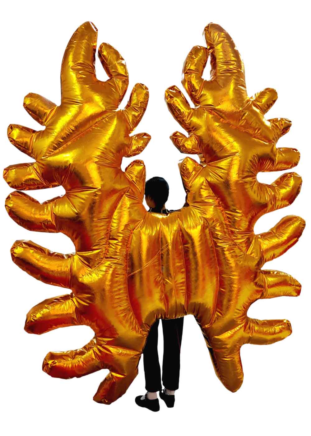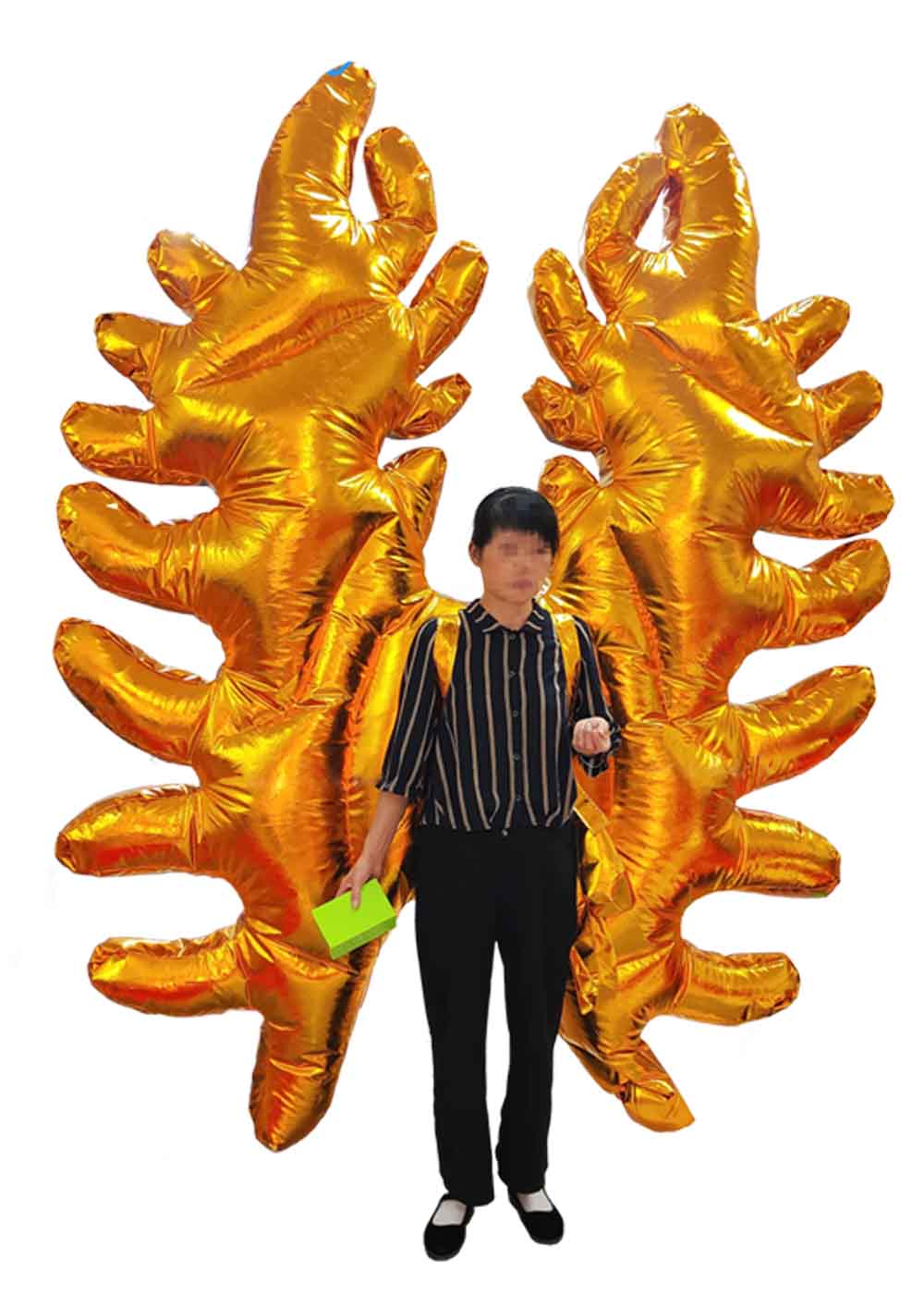 Золотые надувные крылья - потрясающий декоративный реквизит, который добавит великолепия и магии вашему мероприятию. Высота 2 метра. Крылья привлекут внимание своим элегантным дизайном и роскошным золотым цветом, создавая атмосферу волшебства и торжества. Надуваются с помощью включенного насоса, а прочные веревки обеспечивают надежное крепление. После использования крылья можно быстро и компактно убрать в упаковочный мешок, что делает транспортировку и хранение невероятно удобными.